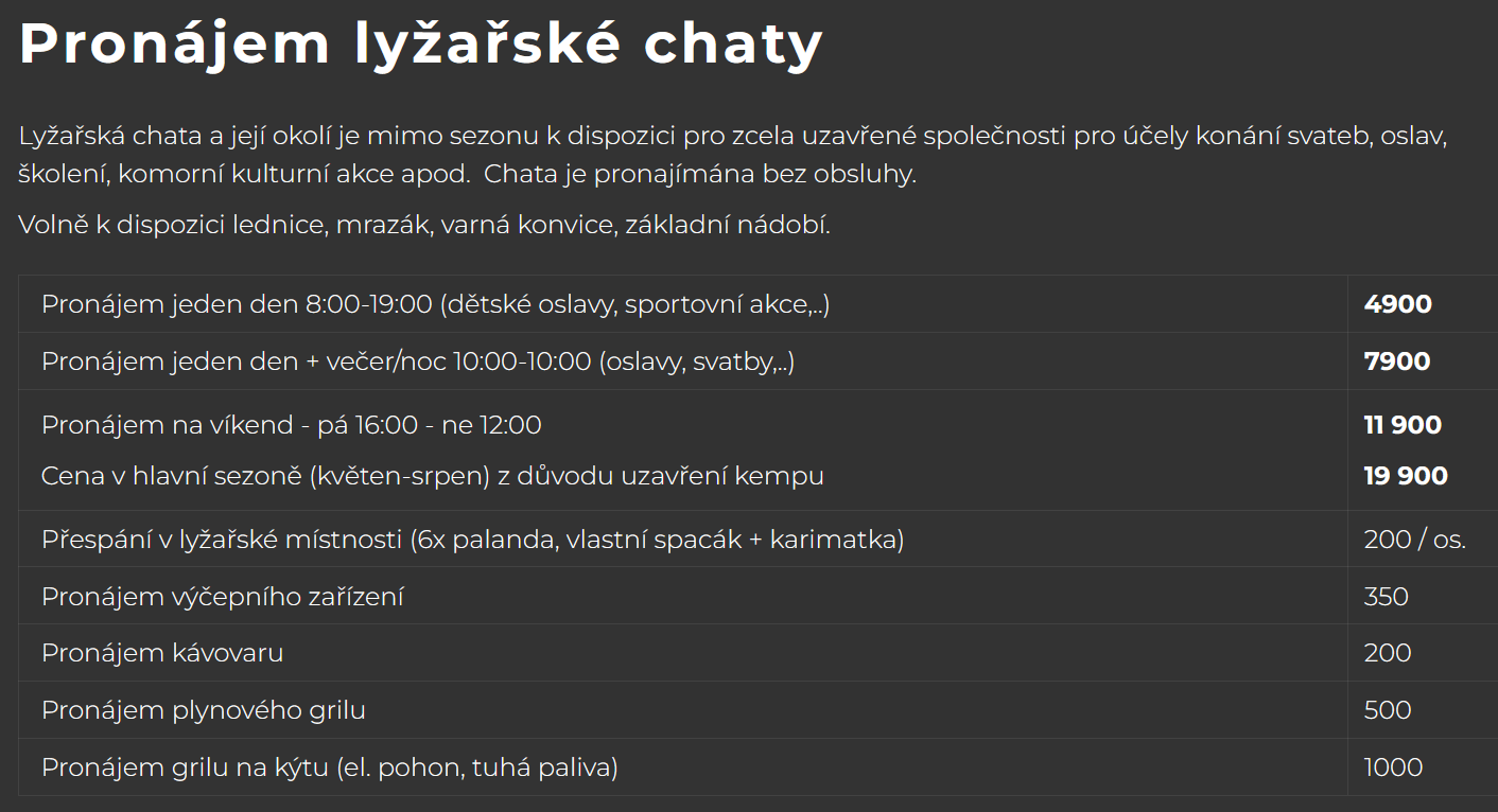 Zde naleznete ceníky služeb, které pro tuto chvíli poskytujeme. Jedná se o přespání v kempu a pronájem chaty pro soukromé či komerční užití. Všechny ceny jsou uvedeny včetně DPH.